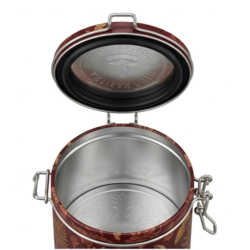 Esse Lata redonda de metal possui tampa com trava com trava, e possui um anel de borracha ao redor da tampa que